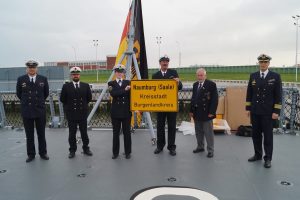 Seit Mai 2021 fährt dieses extra gefertigte Ortsschild auf der Fregatte Sachsen-Anhalt. Die damalige Crew hat sich zur Ausschmückung der Fregatte, Ortsschilder aus Sachsen-Anhalt gewünscht. Der Landesverband hat das organisiert und aus fast allen Marinekameradschaften ein Ortsschild bekommen und an Bord überreicht.